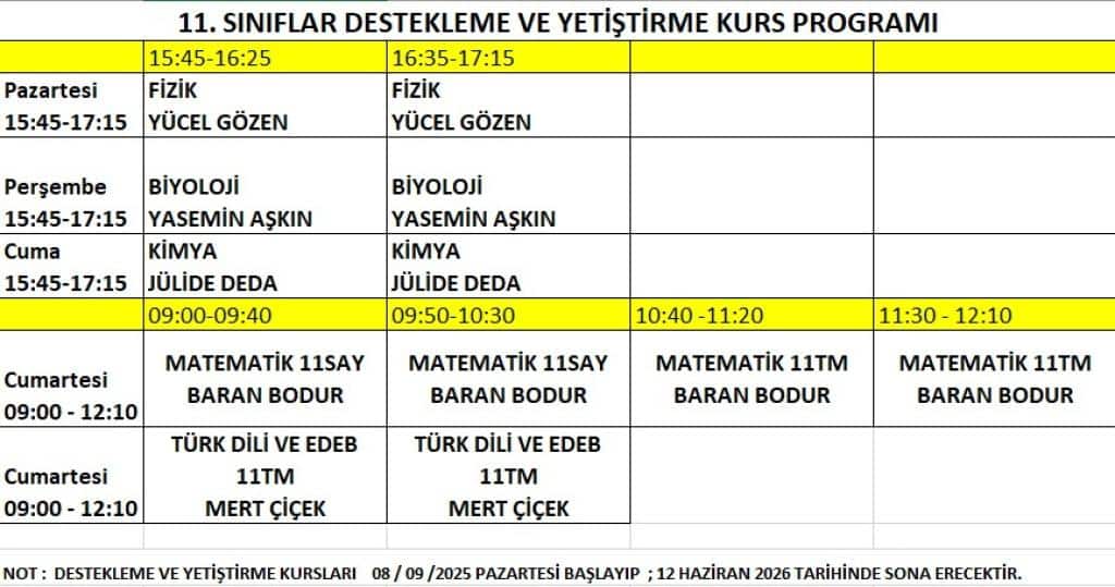 11. SINIF KURS PROGRAMI ( 8 Eylül pazartesi başlayacaktır.)